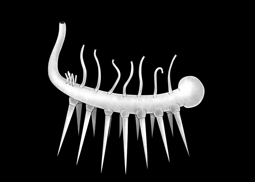以前はこの化石に基いて、向かって左の黒い部分があたま、上側にあるとげとげが足で、下側に伸びているのは触手と思われていて、こういう想像図だったのね。