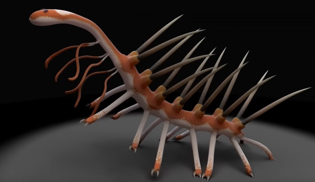 後にカナダや中国などで発見された同種の個体を調べてみたら、触手と思われていた部分の先端に爪のようなものがあり、尻尾と思われていた部分に口と歯のような痕跡が発見されて、現在の想像図では前後と上下が逆のこういう形になっているんだよ。